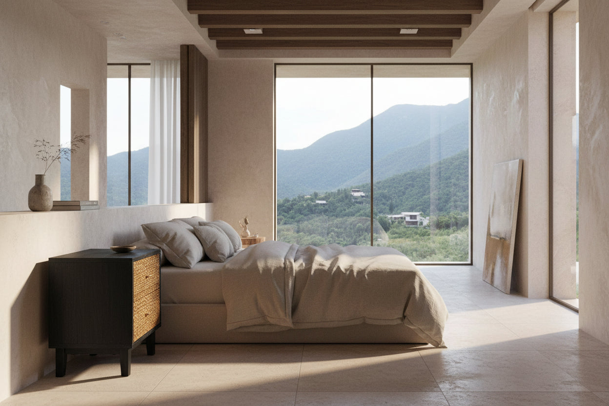 The main structure features a dark frame paired with natural rattan panels, employing a "square cabinet + slender legs" design, combining storage functionality with a natural aesthetic.